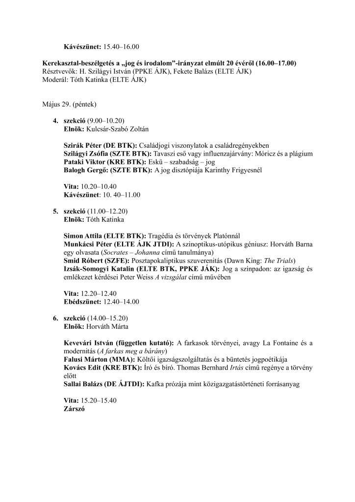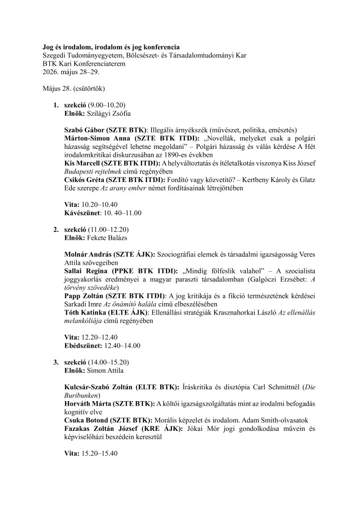 Konferenciánk célja kettős. Egyfelől folytatni szeretnénk azt a jogelméleti gondolkodás által kezdeményezett dialógust, amely a jog és irodalom viszonyrendszerét faggatja. Másfelől azonban, ugyanilyen komoly hangsúlyt helyezve az irodalom- és kultúratudományok eredményeire, ezek perspektívájából is erősíteni kívánjuk az interdiszciplináris párbeszédet a két terület képviselői között.